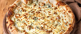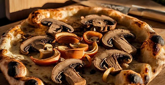 Une création plus douce, plus enveloppante, comme une promenade en sous-bois. La base crème est légère, à base végétale, subtilement parfumée à la noix de muscade et au poivre blanc. Viennent ensuite les champignons : shiitakés, pleurotes ou champignons de Paris selon la cueillette du jour, sautés à l’ail et au vin blanc. Quelques oignons rouges confits ajoutent une touche sucrée et une belle couleur. Une pluie de cerneaux de noix croquants vient couronner l’ensemble. C’est une pizza automnale, profonde, qui réchauffe l’âme et évoque la mousse fraîche, la sève et le bois.