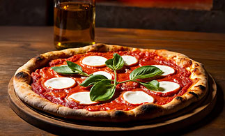 La plus simple, la plus pure, et pourtant jamais banale. Sur une base de sauce tomate maison mijotée lentement avec de l’ail, un soupçon d’huile d’olive vierge et une pincée de sel marin, se dépose une mozzarella fondante au lait biologique, douce et légèrement lactée. Juste avant la sortie du four, des feuilles de basilic frais viennent apporter leur parfum herbacé et poivré, évoquant les étés méditerranéens. La pâte, légèrement gonflée, dorée par la pierre chaude, chante à la découpe. C’est une pizza qui respecte la tradition tout en la sublimant par la qualité de ses matières premières.